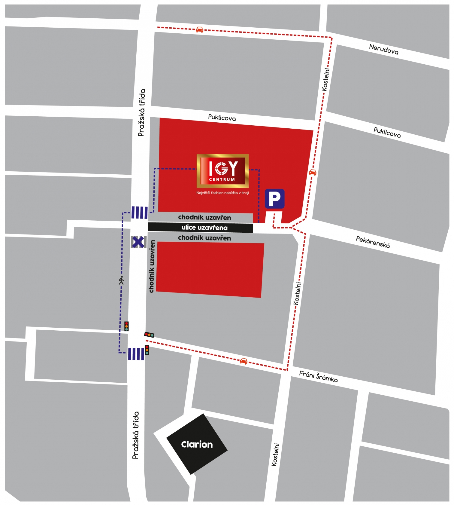 „Odbor dopravy a silničního hospodářství magistrátu vyhověl žádosti akciové společnosti Metrostav a povolil úplnou uzavírku místní komunikace v ulici Pekárenská, konkrétně v úseku ulic Pražská třída – Kostelní. Důvodem je zajištění bezpečnostní manipulační plochy po dobu výstavby propojovacích mostů mezi obchodním centrem IGY a stavbou IGY 2. Od 27. února do 9. dubna dále povolil úplnou uzavírku chodníku podél stavby IGY 2 na Pražské třídě. Zároveň zrušil přechod pro chodce pro zajištění výstavby odbočovacího pruhu z Pražské třídy do ulice Pekárenská,“ uvedl ředitel IGY Centra Michal Lojka.